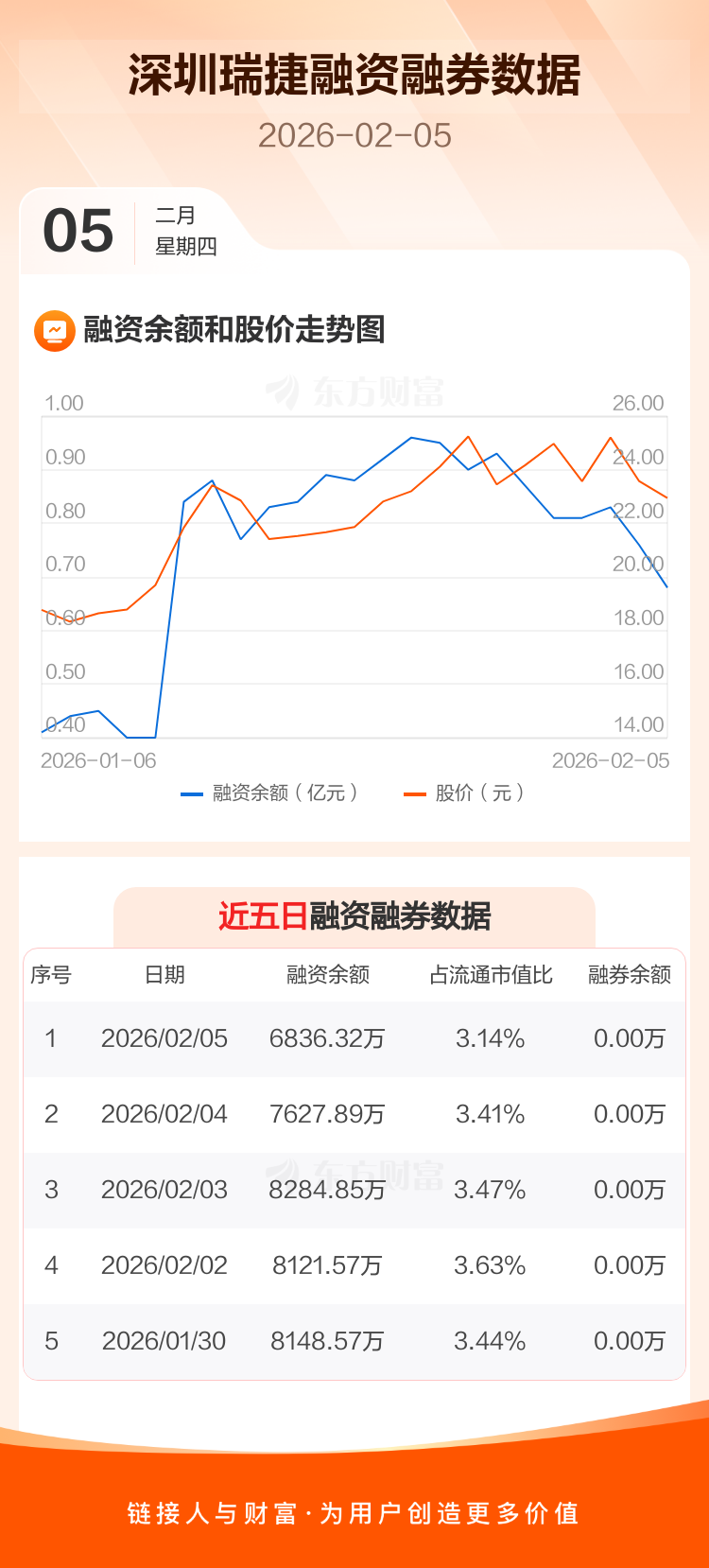 交易所最新数据显示,深圳瑞捷于2026年2月5日获融资买入1395.20万元,融资偿还2186.77万元,当日融资净偿还791.57万元。目前,该股融资余额6836.32万,占流通市值比例为3.14%。