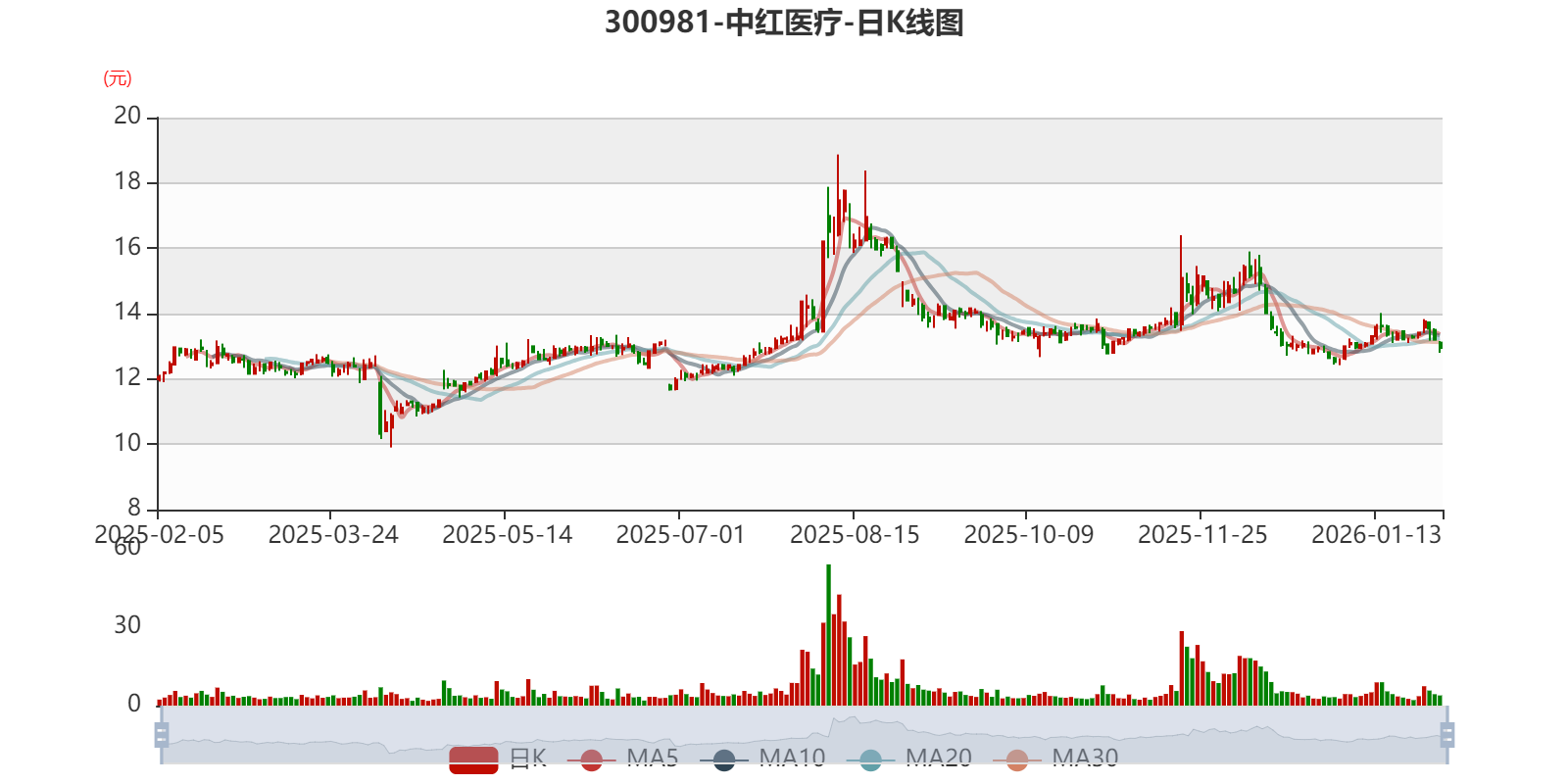 中证智能财讯中红医疗(300981)1月29日晚间披露2025年度业绩预告,预计2025年实现营业收入20.97亿元至27.26亿元;归母净利润亏损8700万元至1.31亿元,上年同期亏损8713万元;扣非净利润亏损1.25亿元至1.87亿元,上年同期亏损8713万元。以最新收盘价计算,市净率(LF)约1.03倍,市销率(TTM)约2.3倍。