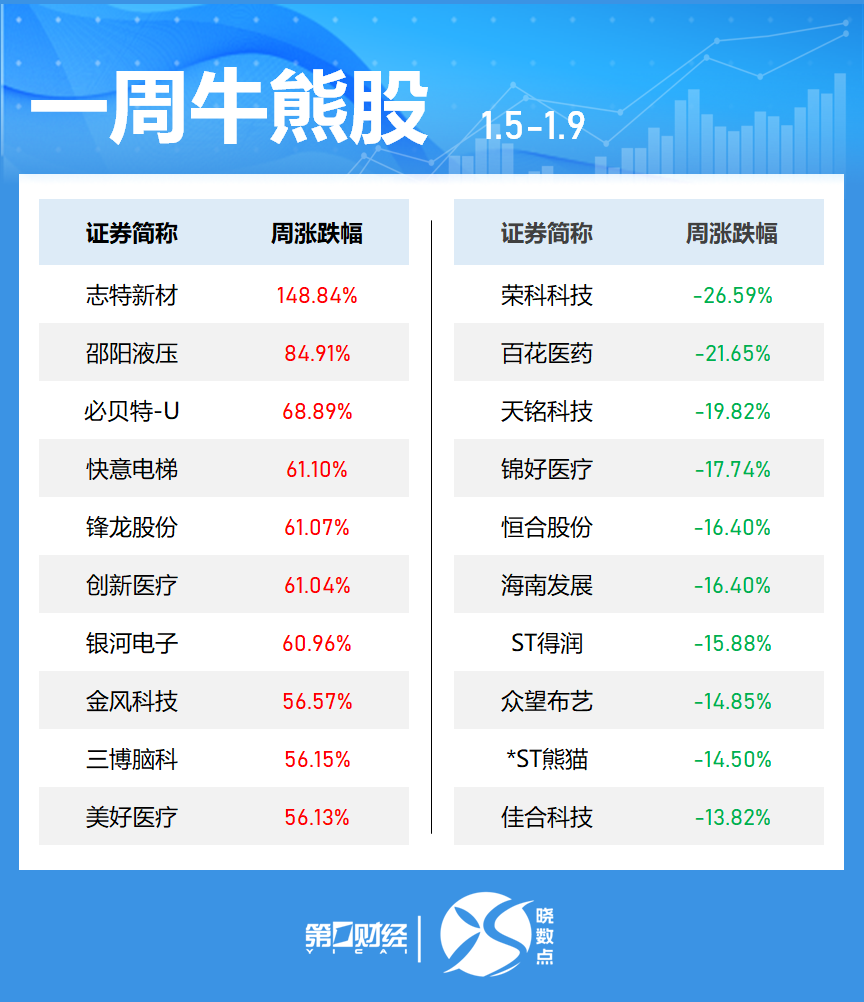 Wind数据显示,本周(1月5日至1月9日)共有7只个股涨幅超60%,有13只个股涨幅超50%。