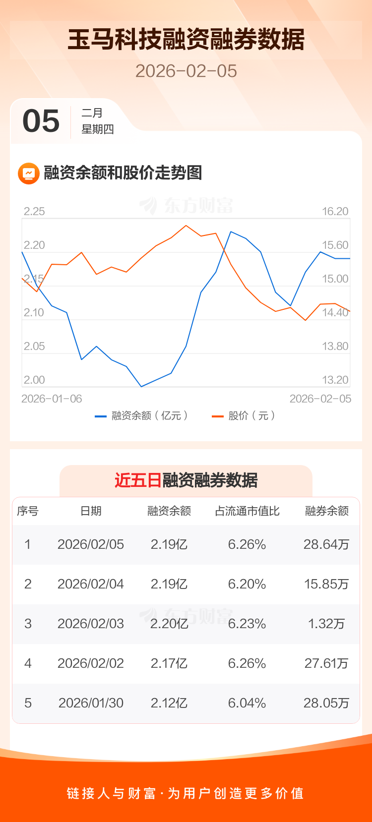 交易所最新数据显示,玉马科技于2026年2月5日获融资买入289.88万元,融资偿还312.15万元,当日融资净偿还22.27万元。目前,该股融资余额2.19亿,占流通市值比例为6.26%。