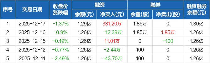 久祺股份融资融券信息显示,2025年12月17日融资净买入331.2万元;融资余额1.29亿元,较前一日增加2.63%。
