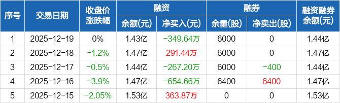 奇德新材:融资净偿还349.64万元,融资余额1.43亿元(12-19)