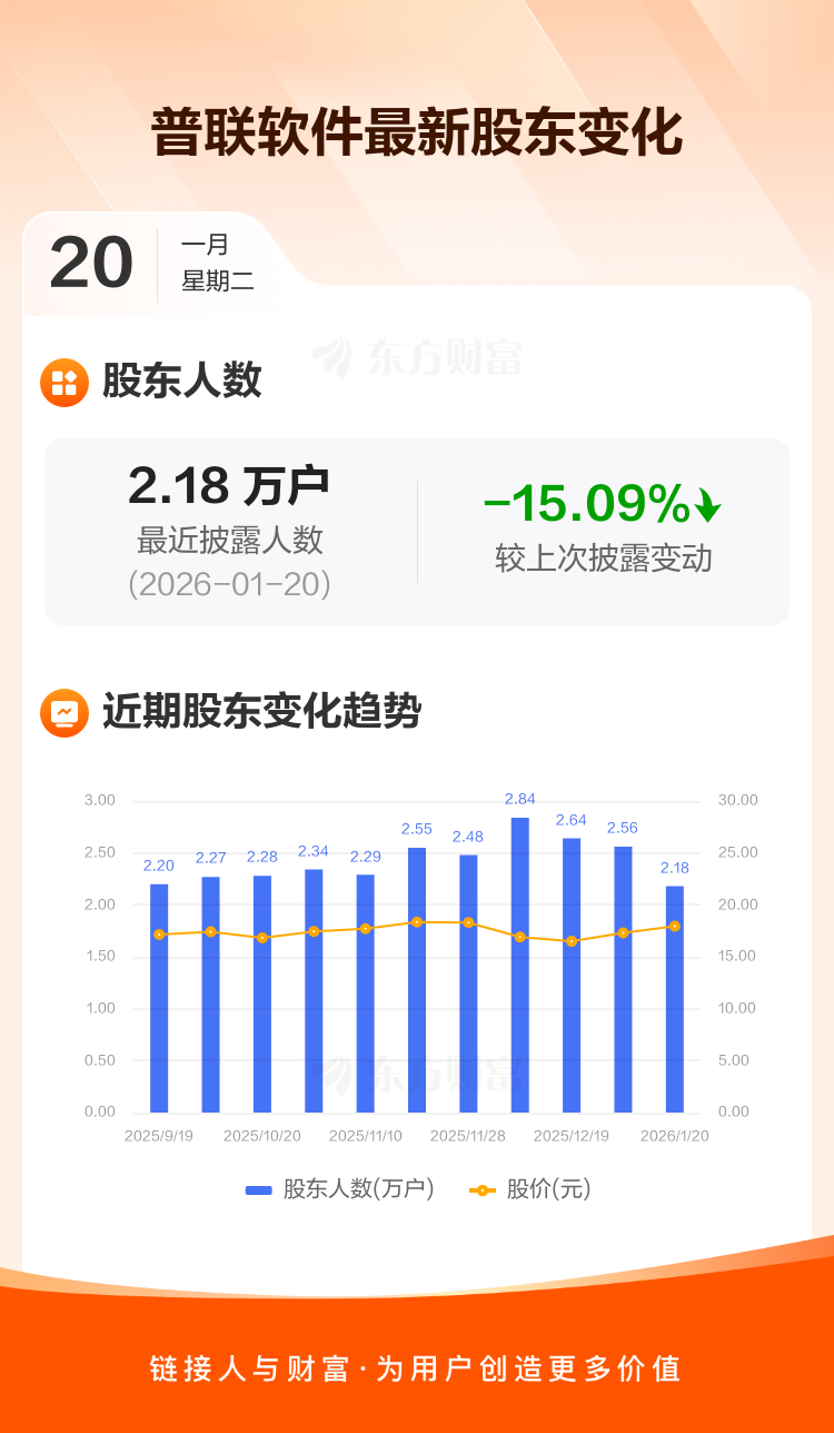 普联软件:截至1月20日最新股东户数2.18万户,较上期减少15.09%