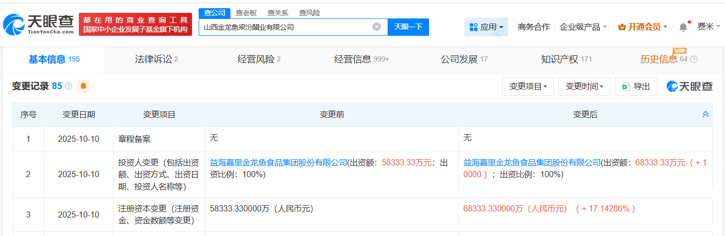 南方财经10月14日电,天眼查App显示,近日,山西金龙鱼梁汾醋业有限公司发生工商变更,注册资本由约5.8亿人民币增至约6.8亿人民币,增幅约17%。该公司成立于2010年11月,法定代表人为张林,经营范围包括食醋产品的研发、技术咨询、技术服务等,由金龙鱼(300999)全资持股。