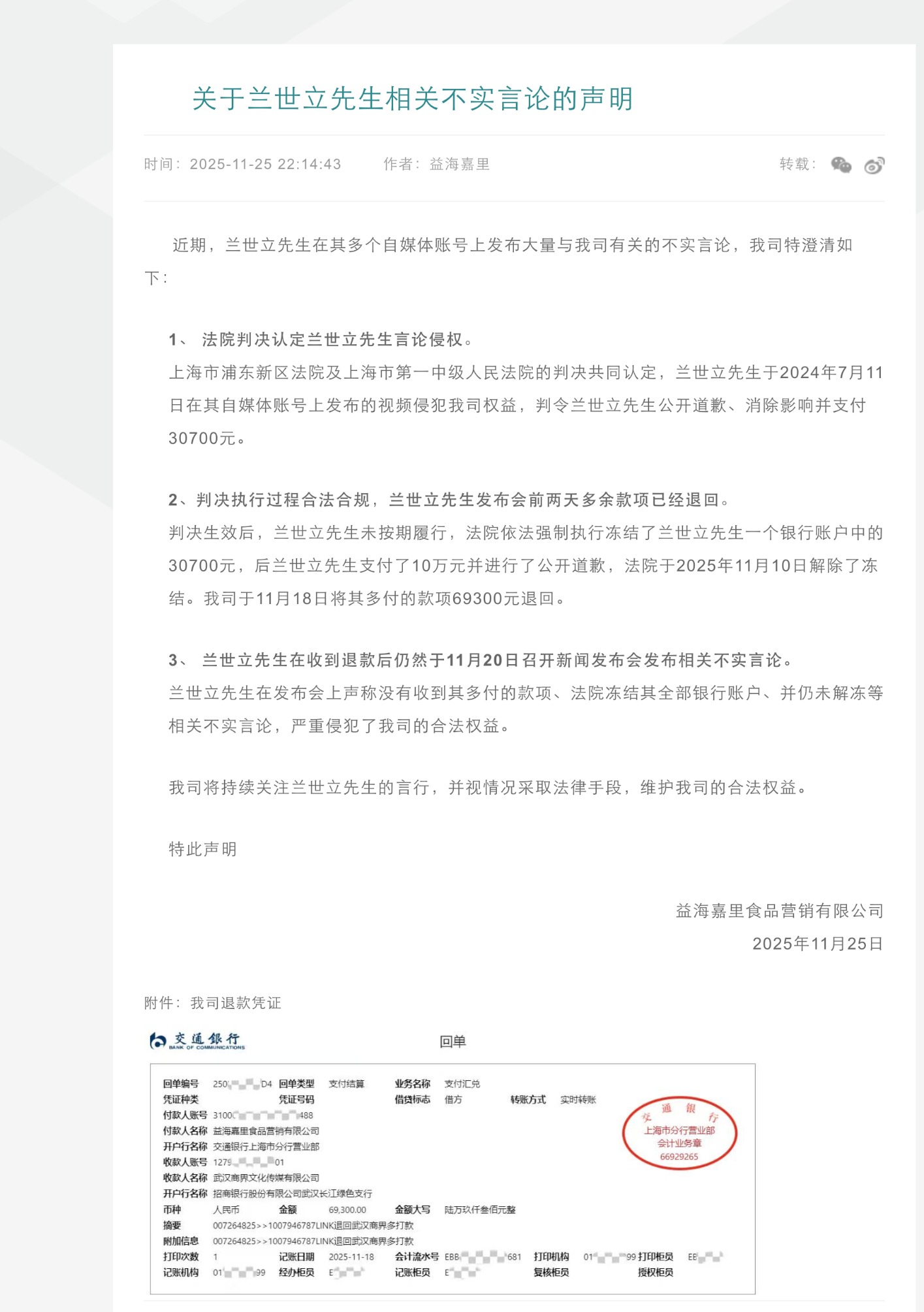 11月25日晚,益海嘉里食品营销有限公司通过金龙鱼官方网站发布声明称,上海市浦东新区法院及上海市第一中级人民法院的判决共同认定,兰世立于2024年7月11日在其自媒体账号上发布的视频侵犯公司权益,判令兰世立公开道歉、消除影响并支付30700元。判决生效后,兰世立未按期履行,法院依法强制执行冻结了兰世立一个银行账户中的30700元,后兰世立支付了10万元并进行了公开道歉,法院于2025年11月10日解除了冻结。公司于11月18日将其多付的款项69300元退回。