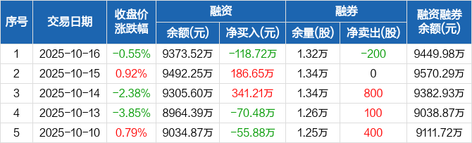 融资方面,当日融资买入332.03万元,融资偿还450.75万元,融资净偿还118.72万元。融券方面,融券卖出0股,融券偿还200股,融券余量1.32万股,融券余额76.46万元。融资融券余额合计9449.98万元。