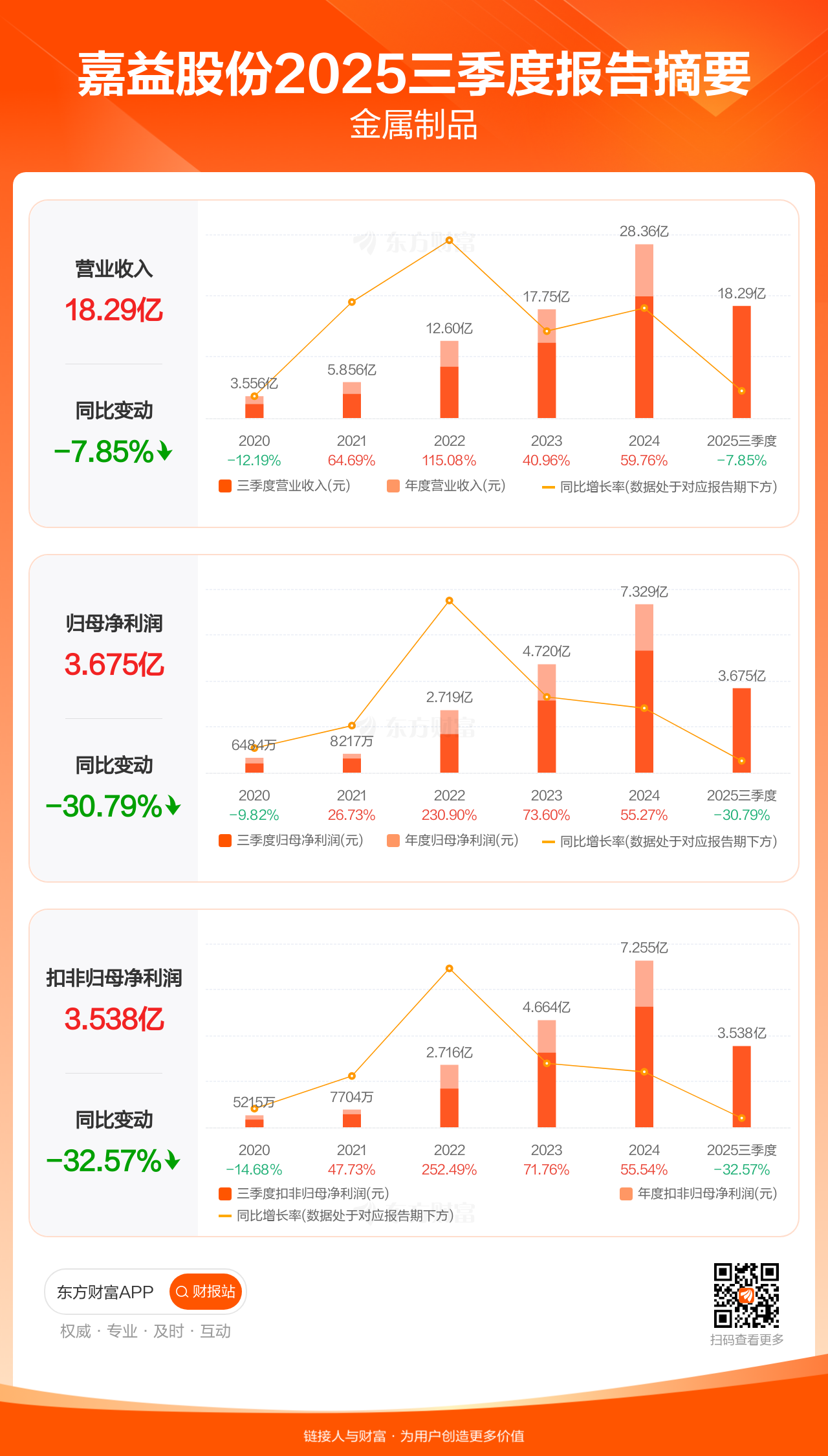 嘉益股份10月29日发布2025年三季报显示,公司前三季实现营业收入18.29亿元,同比下滑7.85%;归母净利润3.68亿元,同比下滑30.79%;扣非归母净利润3.54亿元,同比下滑32.57%。