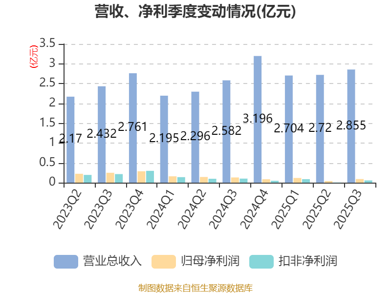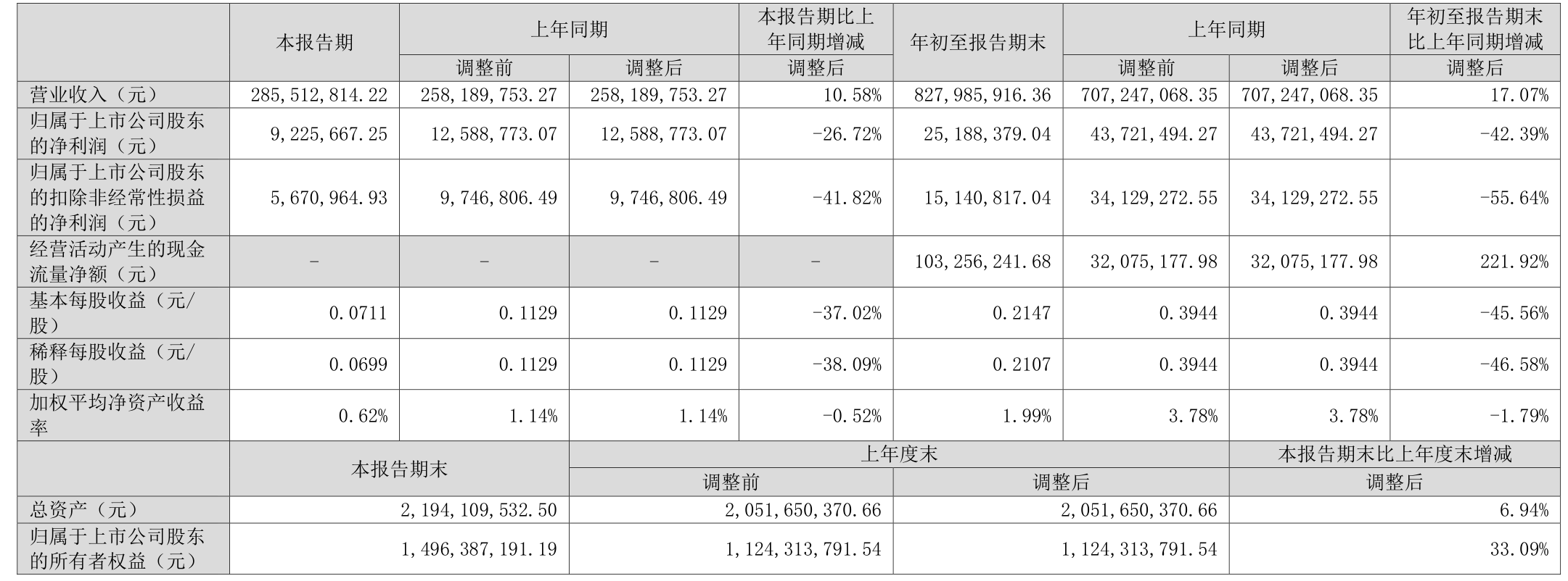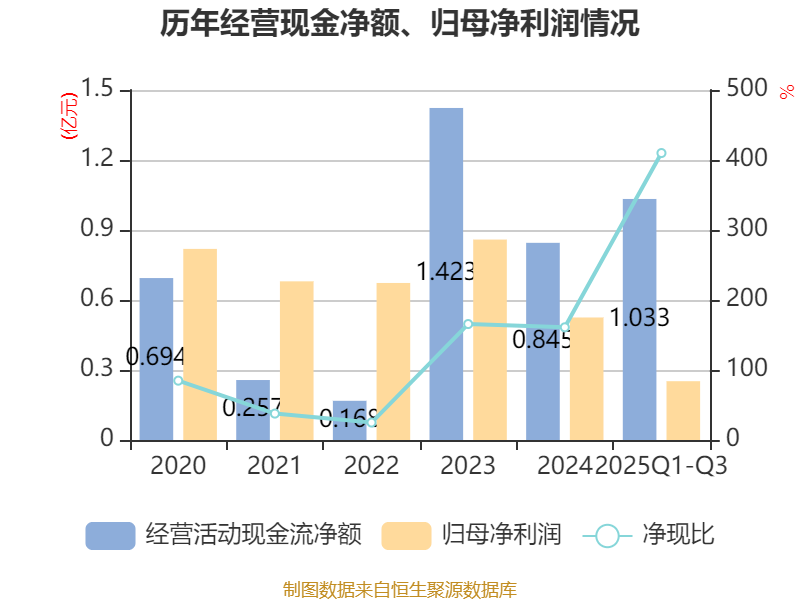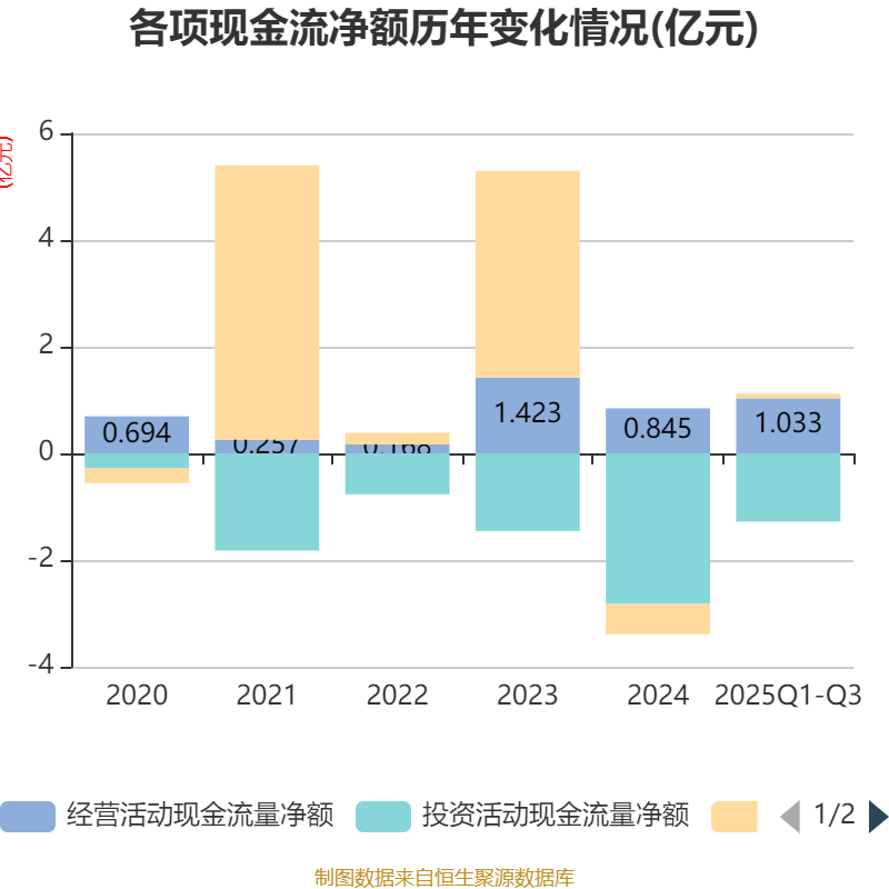 2025年前三季度,公司经营活动现金流净额为1.03亿元,同比增长221.92%;筹资活动现金流净额866.71万元,同比增加3444.56万元;投资活动现金流净额-1.28亿元,上年同期为-2.72亿元。