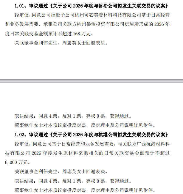 董事鲍佳女士对该项议案投反对票,其反对理由为:侨治公司是实控人董事长金利伟个人名下公司,金利伟存在公开承诺“本人将尽量避免与发行人之间产生关联交易事项,对于不可避免的关联业务往来或交易,将按照公平、公允和等价有偿的原则进行,交易价格将按照市场公认的合理价格确定”。
