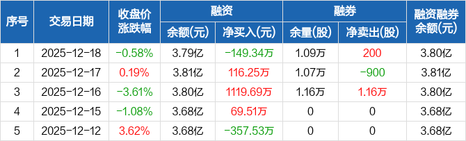 融资方面,当日融资买入1379.58万元,融资偿还1528.92万元,融资净偿还149.34万元。融券方面,融券卖出200股,融券偿还0股,融券余量1.09万股,融券余额27.85万元。融资融券余额合计3.8亿元。