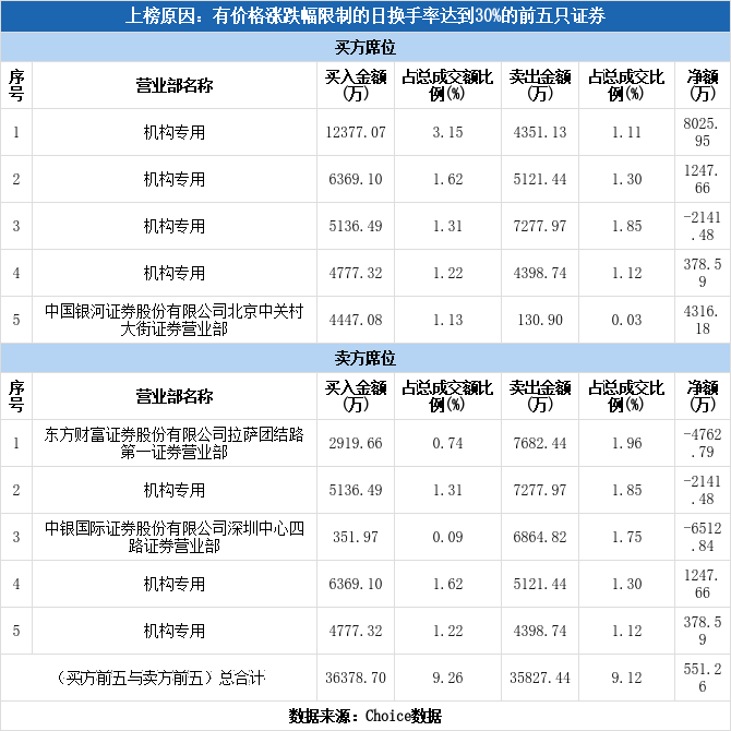 龙虎榜数据显示,今日共7个机构席位出现在龙虎榜单上,分别位列买一、买二、买三、买四、卖二、卖四、卖五,合计净买入7510.71万元,占龙虎榜净买额的1362.45%。