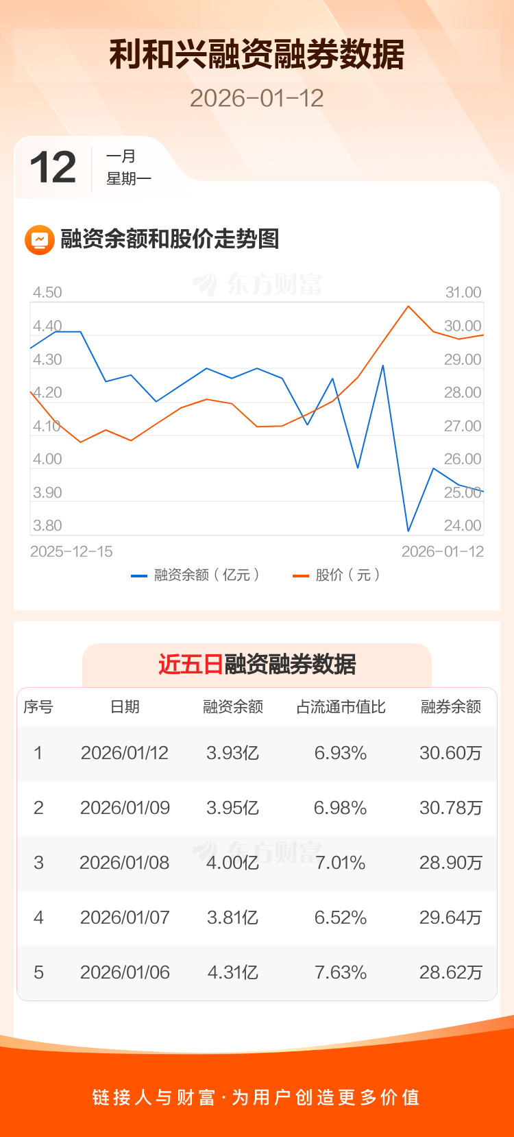 交易所最新数据显示,利和兴于2026年1月12日获融资买入7348.21万元,融资偿还7516.19万元,当日融资净偿还167.98万元。目前,该股融资余额3.93亿,占流通市值比例为6.93%。