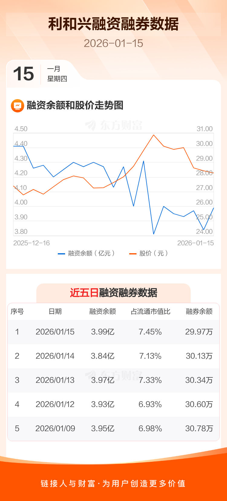 交易所最新数据显示,利和兴于2026年1月15日获融资买入5567.73万元,融资偿还4078.06万元,当日融资净买入1489.67万元。目前,该股融资余额3.99亿,占流通市值比例为7.45%。