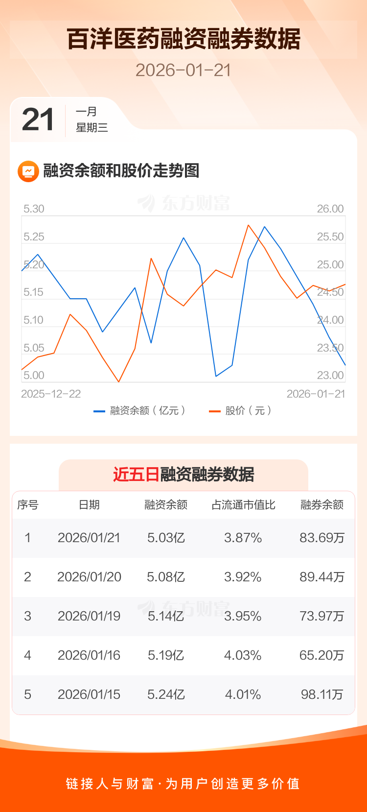 交易所最新数据显示,百洋医药于2026年1月21日获融资买入797.60万元,融资偿还1308.42万元,当日融资净偿还510.82万元。目前,该股融资余额5.03亿,占流通市值比例为3.87%。