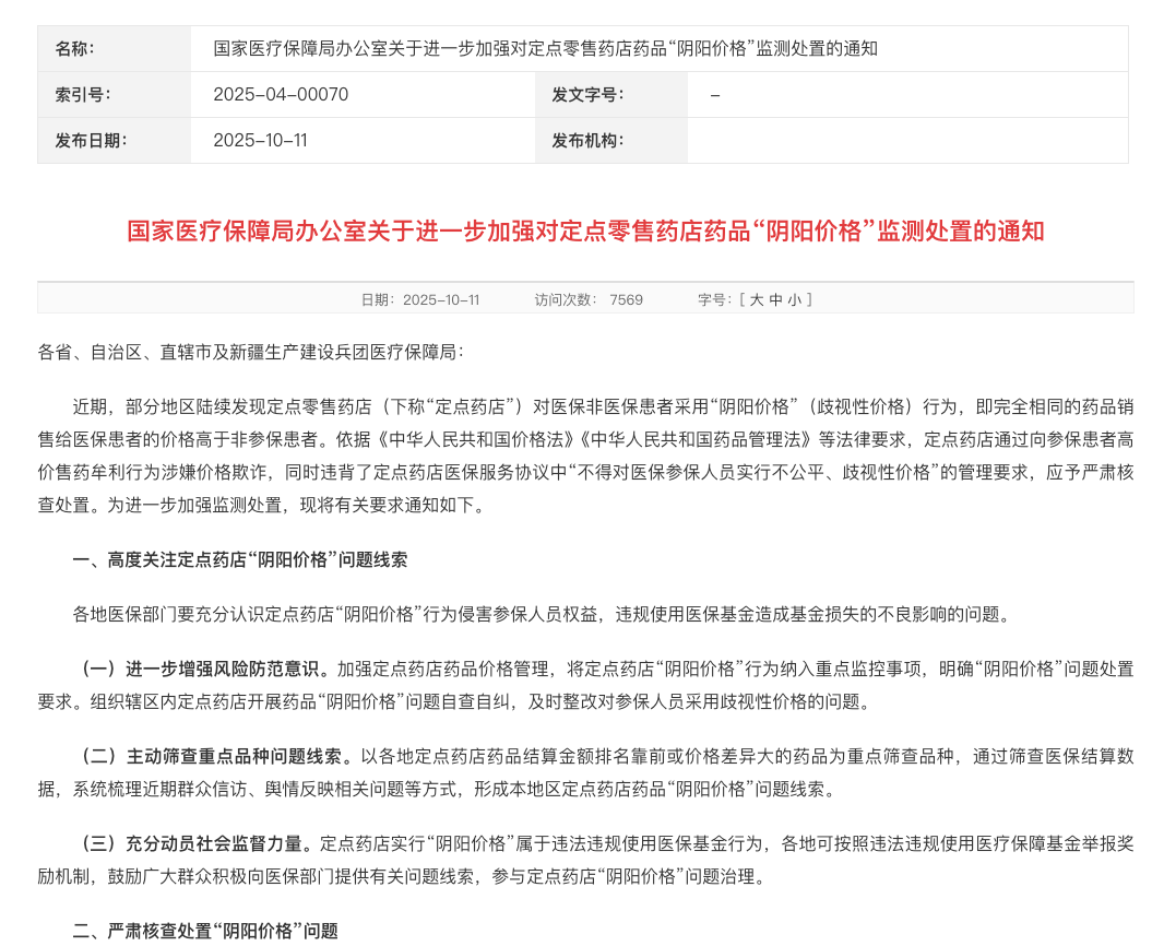 10月11日,国家医保局发布《关于进一步加强对定点零售药店药品“阴阳价格”监测处置的通知》,明确要求各地对“阴阳价格”行为严肃核查处置。