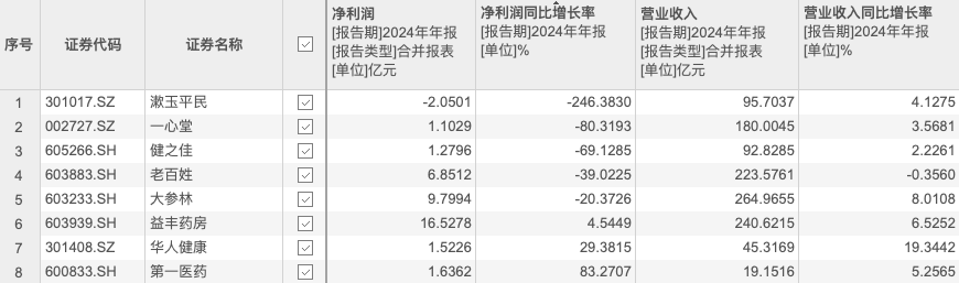 数据显示,零售药店主要上市公司2024年营收增速下滑至个位数甚至负增长,多家公司净利润显著下跌。其中,漱玉平民亏损2.05亿元,同比下降246%;一心堂、健之佳的净利润也大幅下降,分别同比下滑80.32%和69.13%。