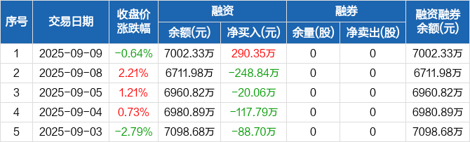 宁波色母:融资净买入290.35万元,融资余额7002.33万元(09-09)