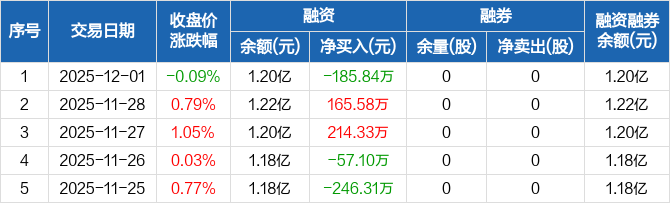 海泰科:融资净偿还185.84万元,融资余额1.2亿元(12-01)