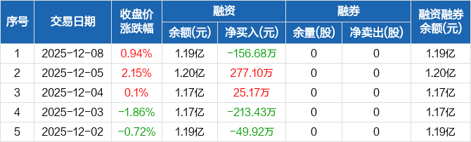 海泰科:融资净偿还156.68万元,融资余额1.19亿元(12-08)