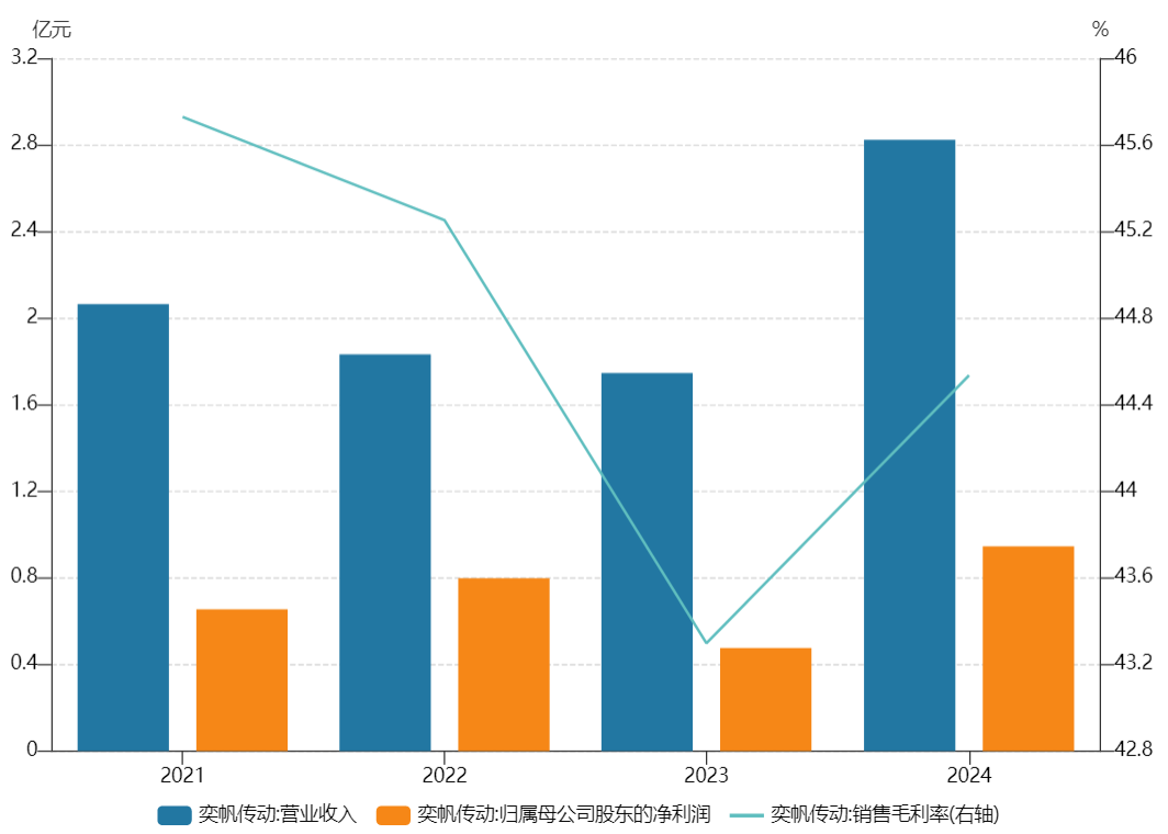 自2021年7月登陆A股后,奕帆传动业绩表现一般、波动状态。2021年至2023年,公司分别实现营收2.06亿元、1.83亿元、1.75亿元,归母净利润0.66亿元、0.8亿元、0.48亿元。