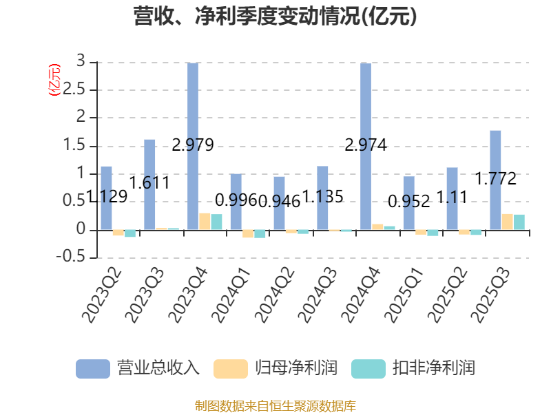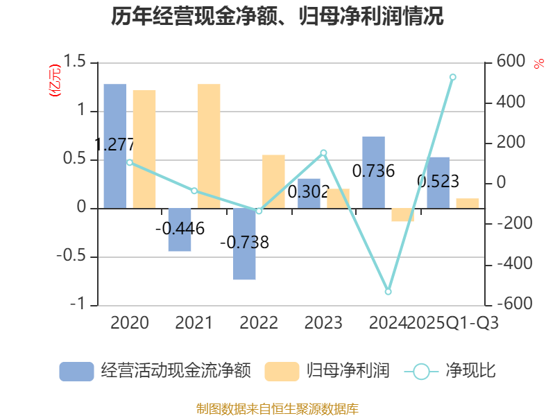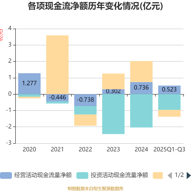 2025年前三季度,公司经营活动现金流净额为5233.16万元,同比增加1.11亿元;筹资活动现金流净额-4193.55万元,同比减少1.15亿元;投资活动现金流净额-9585.21万元,上年同期为-5971.6万元。