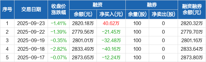 保立佳:融资净买入40.62万元,融资余额2820.18万元(09-23)