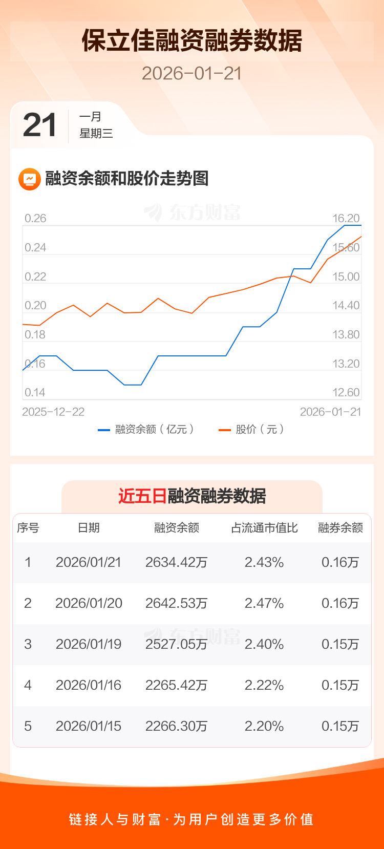 交易所最新数据显示,保立佳于2026年1月21日获融资买入402.35万元,融资偿还410.46万元,当日融资净偿还8.11万元。目前,该股融资余额2634.42万,占流通市值比例为2.43%。