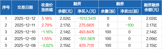 中环海陆:融资净偿还1512.54万元,融资余额2.02亿元(12-12)