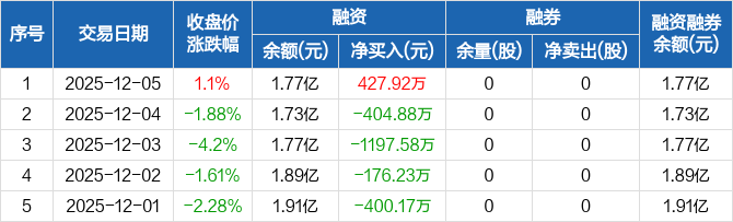 金百泽:融资净买入427.92万元,融资余额1.77亿元(12-05)