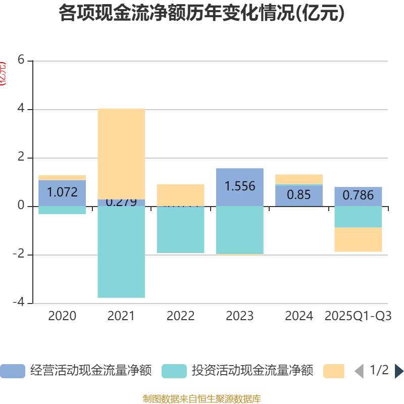 2025年前三季度,公司经营活动现金流净额为7856.07万元,同比增长34.47%;筹资活动现金流净额-9952.13万元,同比减少1.49亿元;投资活动现金流净额-8886.51万元,上年同期为-5896.44万元。