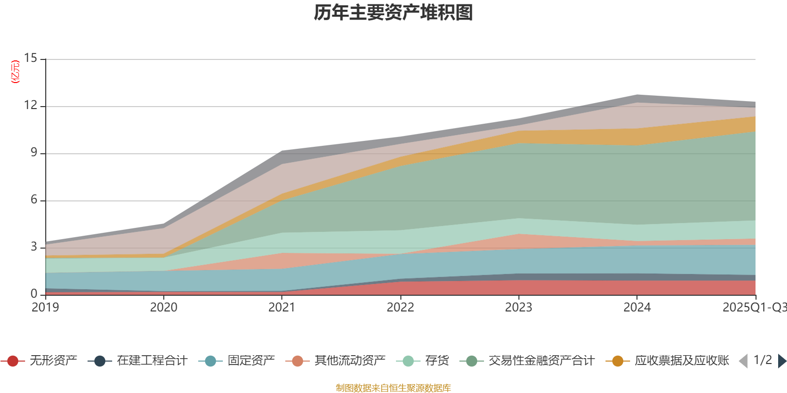 资产重大变化方面,截至2025年三季度末,公司货币资金较上年末减少66.69%,占公司总资产比重下降8.45个百分点;交易性金融资产合计较上年末增加12.23%,占公司总资产比重上升6.5个百分点;固定资产较上年末增加7.8%,占公司总资产比重上升1.65个百分点;存货较上年末增加11.23%,占公司总资产比重上升1.26个百分点。