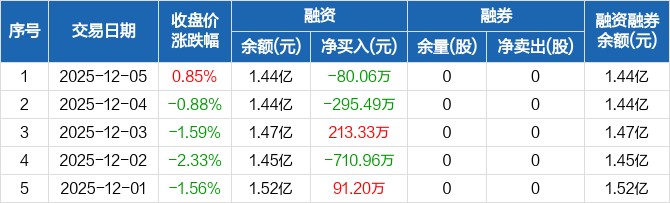 融资方面,当日融资买入689.34万元,融资偿还769.4万元,融资净偿还80.06万元。融券方面,融券卖出0股,融券偿还0股,融券余量0股,融券余额0元。融资融券余额合计1.44亿元。