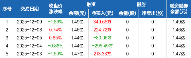 融资方面,当日融资买入919.13万元,融资偿还569.48万元,融资净买入349.65万元。融券方面,融券卖出0股,融券偿还0股,融券余量0股,融券余额0元。融资融券余额合计1.49亿元。