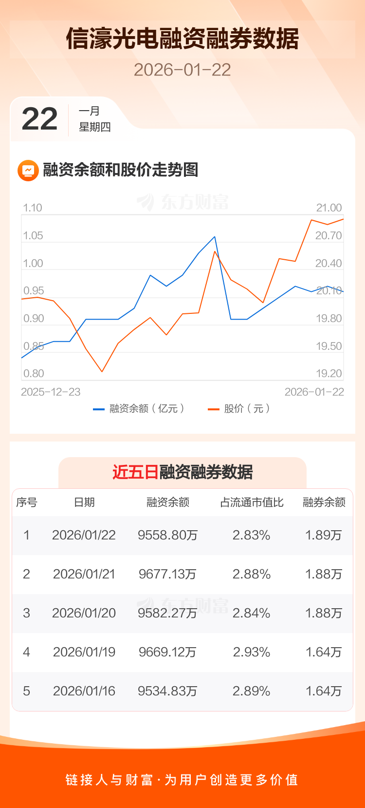 交易所最新数据显示,信濠光电于2026年1月22日获融资买入327.06万元,融资偿还445.39万元,当日融资净偿还118.33万元。目前,该股融资余额9558.80万,占流通市值比例为2.83%。