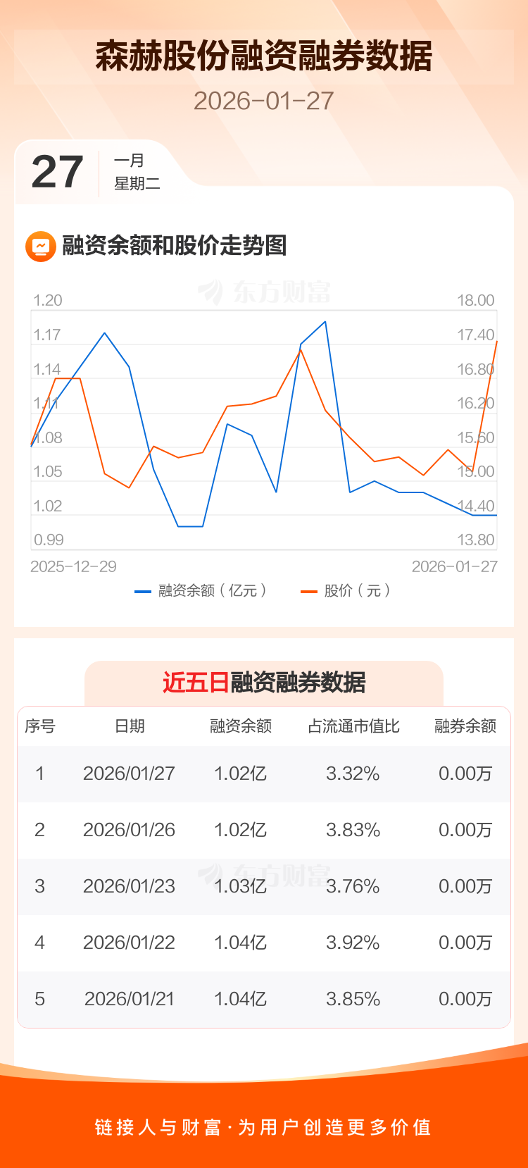 交易所最新数据显示,森赫股份于2026年1月27日获融资买入1461.28万元,融资偿还1485.30万元,当日融资净偿还24.02万元。目前,该股融资余额1.02亿,占流通市值比例为3.32%。