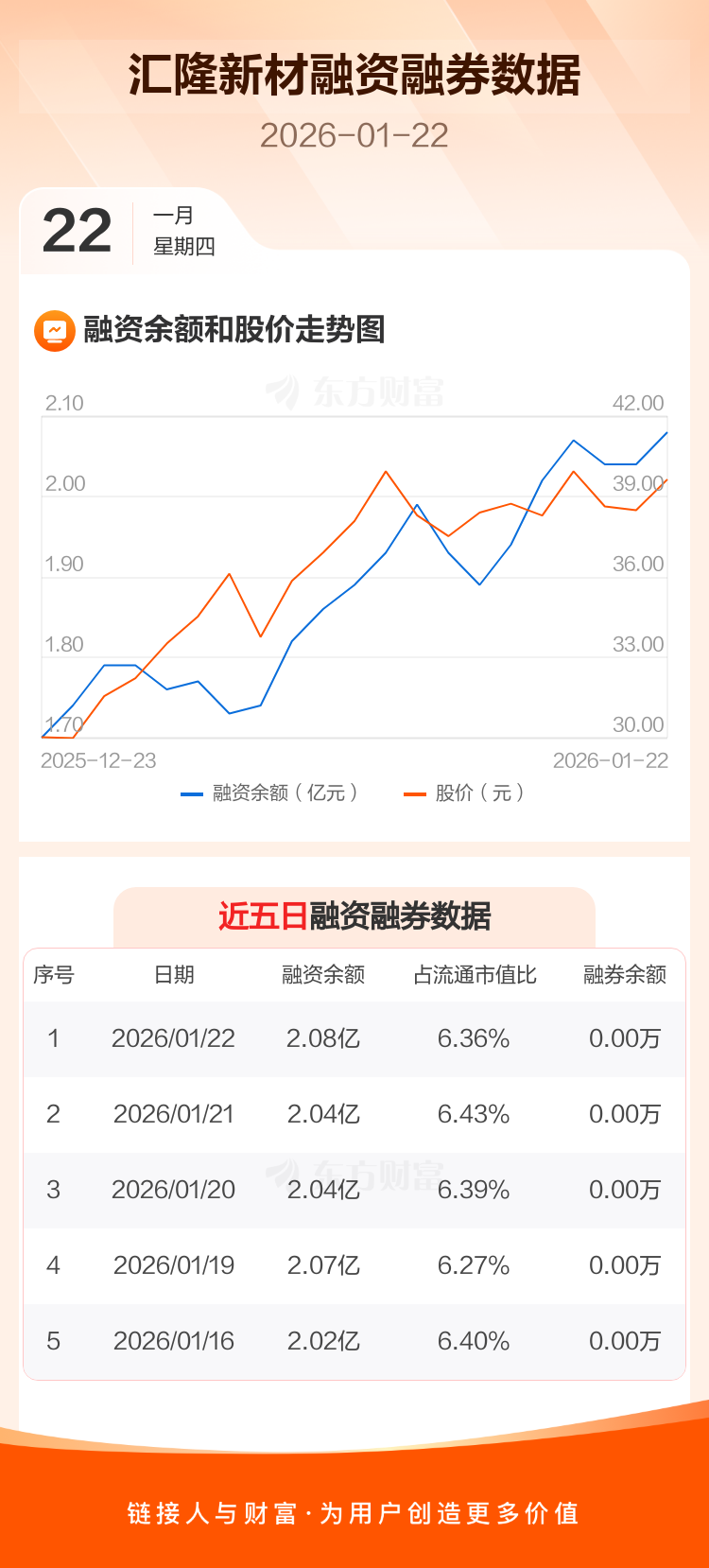 交易所最新数据显示,汇隆新材于2026年1月22日获融资买入1489.92万元,融资偿还1107.90万元,当日融资净买入382.02万元。目前,该股融资余额2.08亿,占流通市值比例为6.36%。
