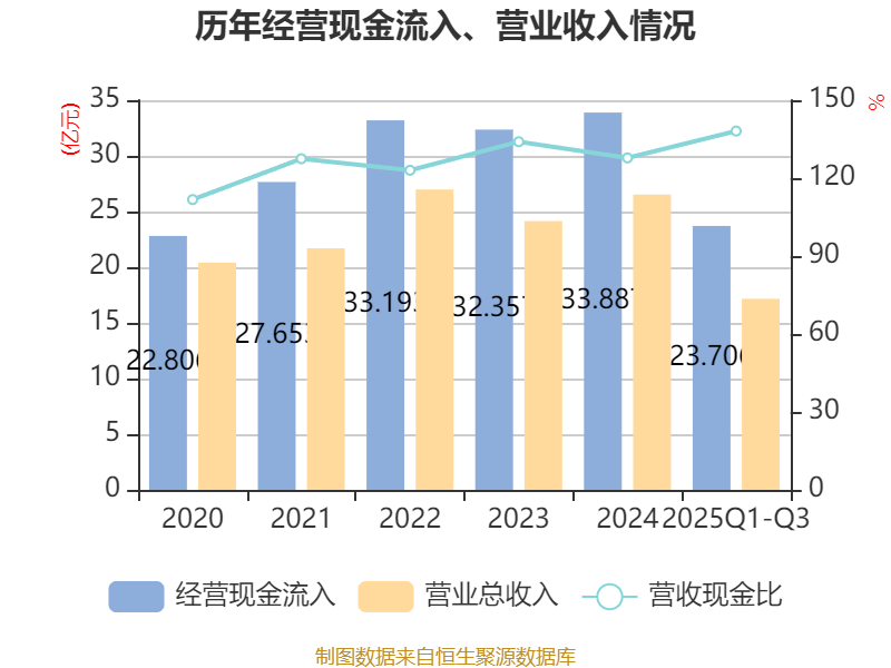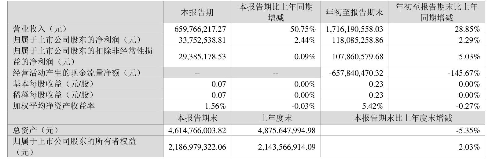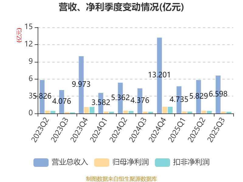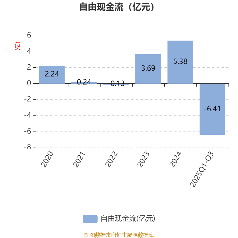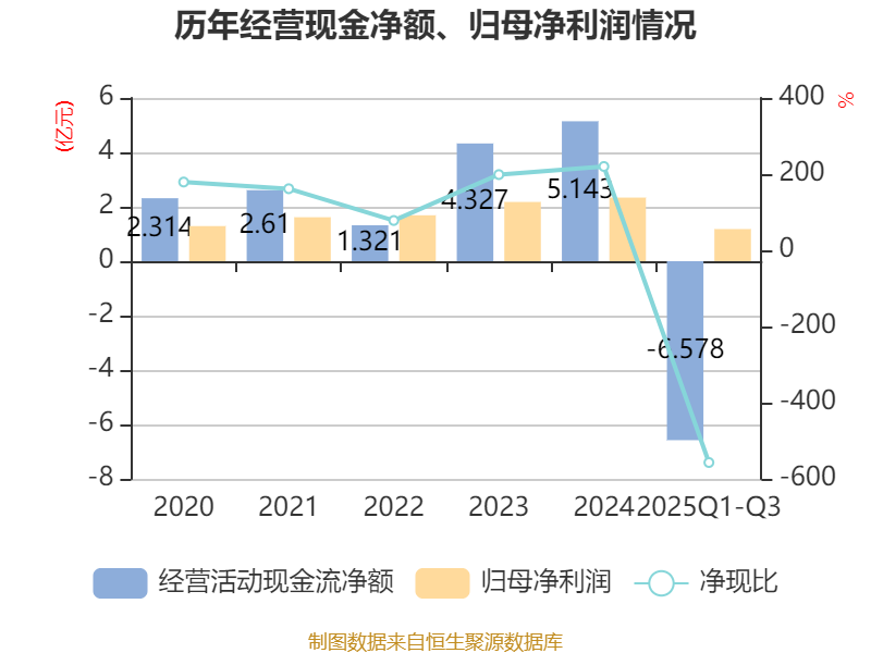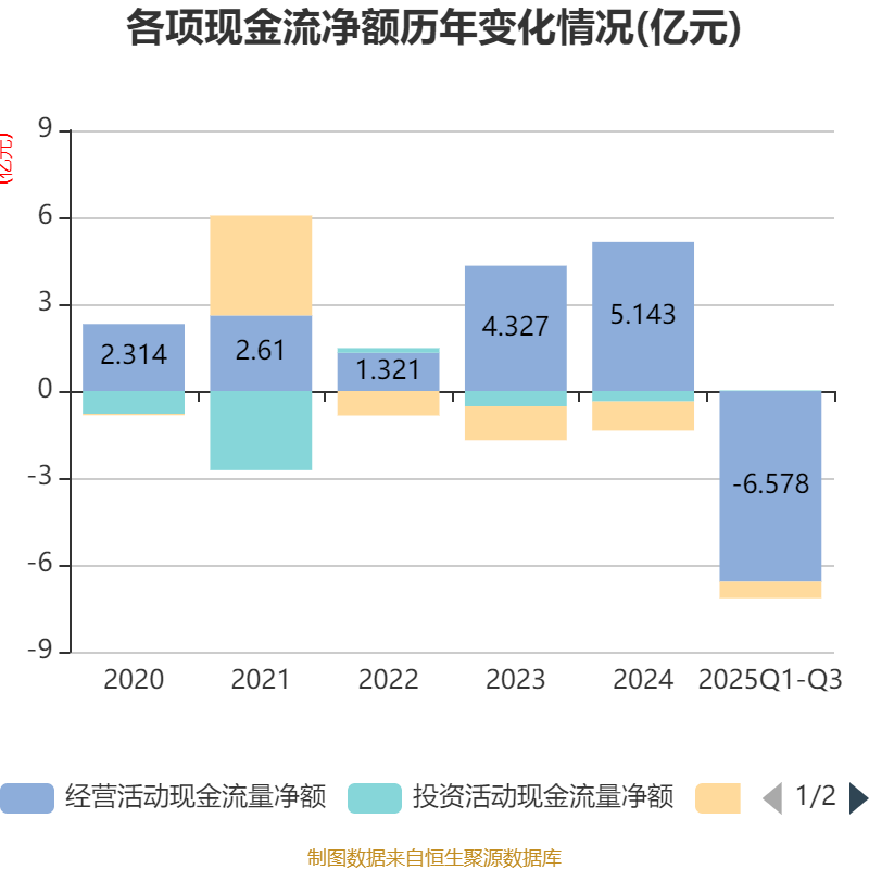 2025年前三季度,公司经营活动现金流净额为-6.58亿元,同比减少3.9亿元;筹资活动现金流净额-5731.16万元,同比增加4091.39万元;投资活动现金流净额240.27万元,上年同期为-2222.54万元。