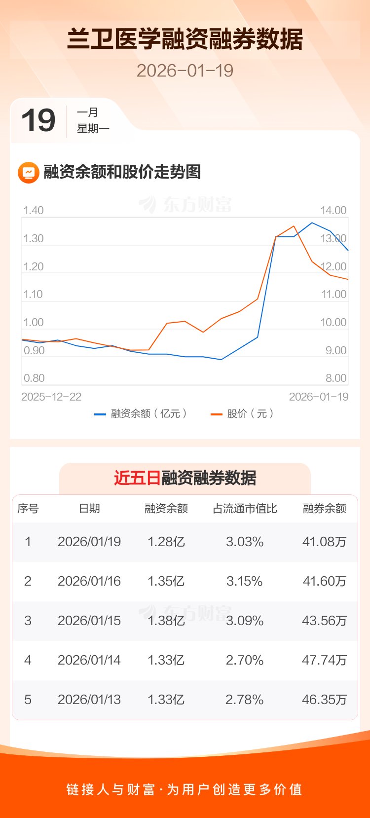 交易所最新数据显示,兰卫医学于2026年1月19日获融资买入1514.15万元,融资偿还2212.56万元,当日融资净偿还698.41万元。目前,该股融资余额1.28亿,占流通市值比例为3.03%。