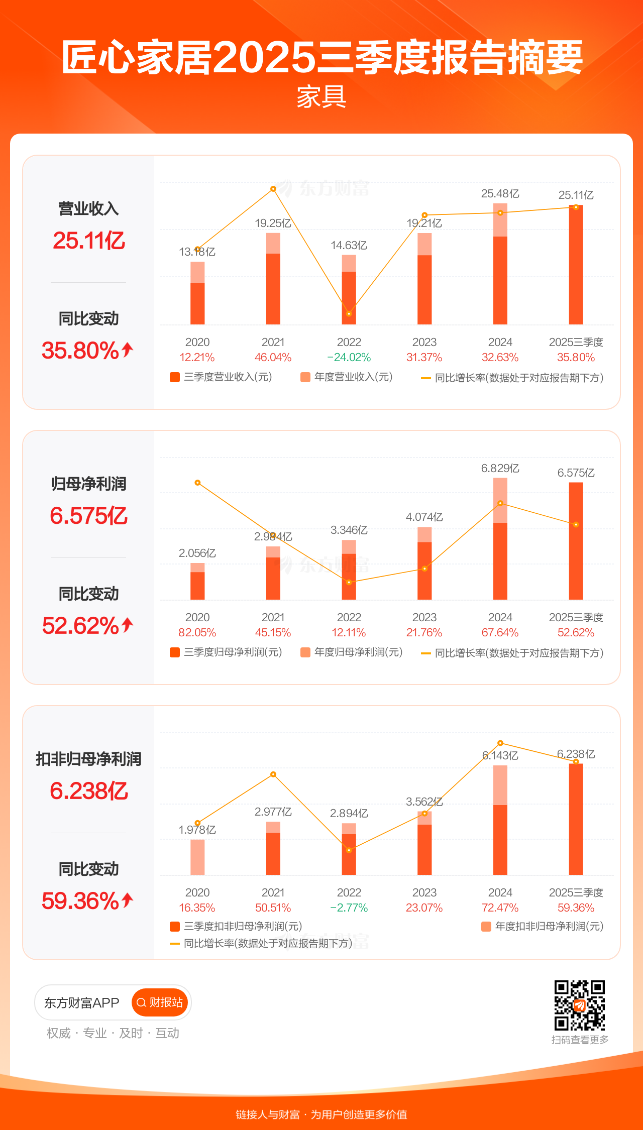 匠心家居10月30日发布2025年三季报显示,公司前三季实现营业收入25.11亿元,同比增长35.80%;归母净利润6.58亿元,同比增长52.62%;扣非归母净利润6.24亿元,同比增长59.36%。