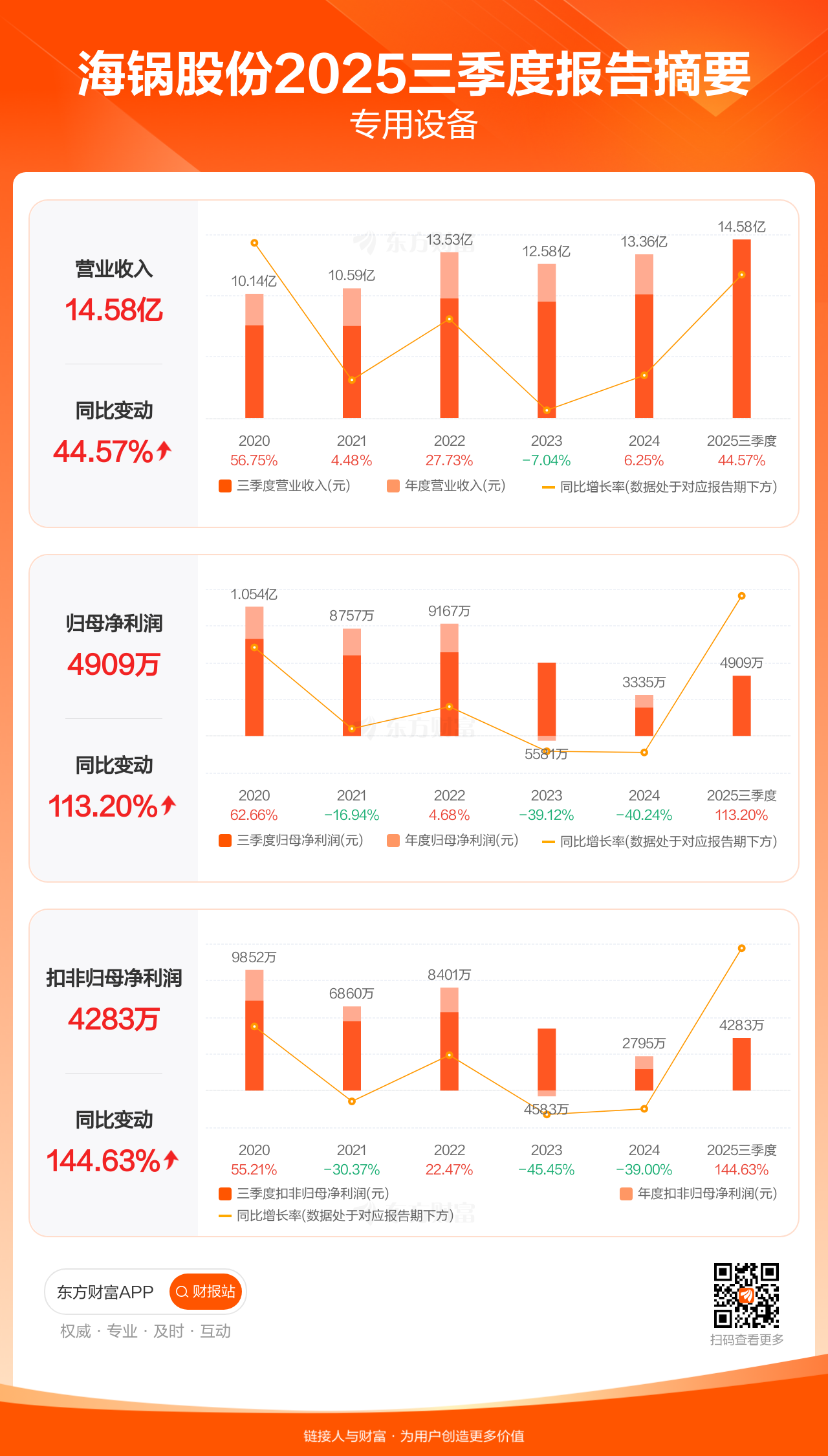 海锅股份10月29日发布2025年三季报显示,公司前三季实现营业收入14.58亿元,同比增长44.57%;归母净利润4909.34万元,同比增长113.20%;扣非归母净利润4282.83万元,同比增长144.63%。