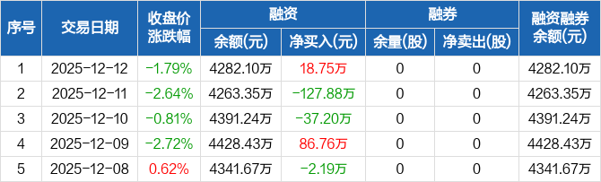 大地海洋:融资净买入18.75万元,融资余额4282.1万元(12-12)