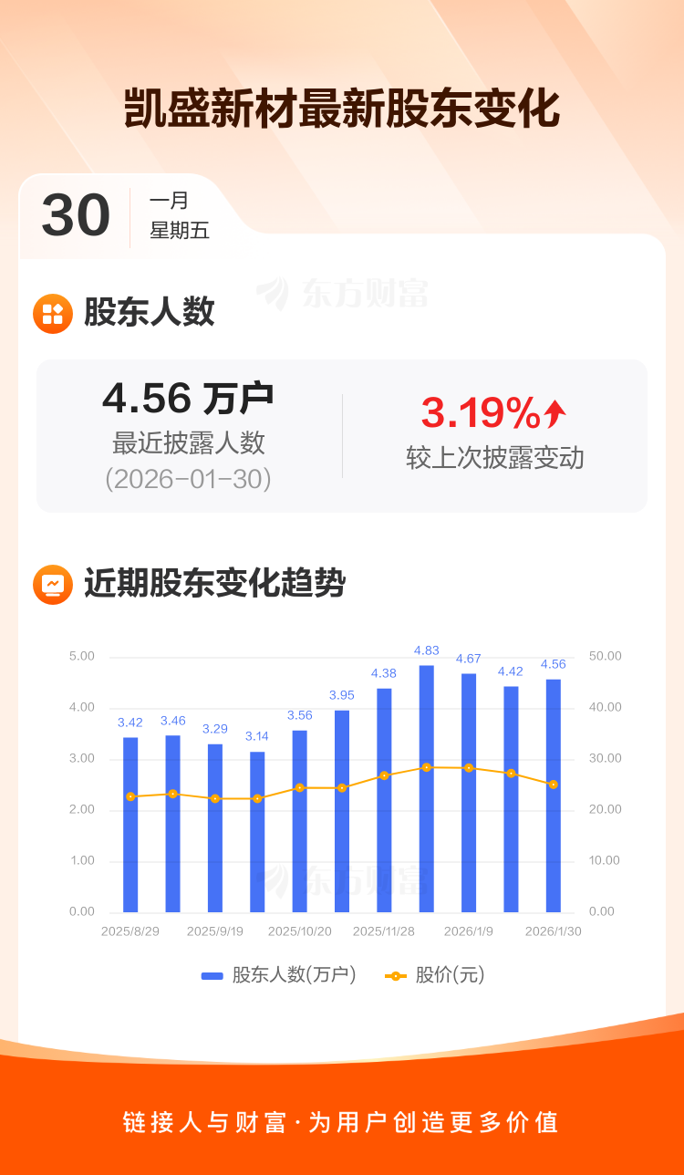凯盛新材:截至1月30日最新股东户数4.56万户,较上期增加3.19%