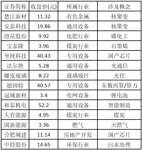 涨停板个股中,股价创出近一年新高的个股有14只(不包括创出历史新高的个股),包括楚江新材、安泰科技、澄星股份、宝泰隆、至纯科技、法尔胜、耀皮玻璃、德固特、冠城新材、和泰机电、大有能源、国新能源、合肥城建、中持股份,具体如下表所示。