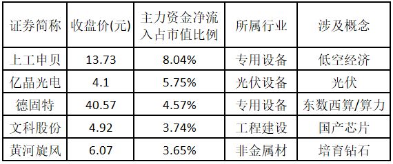 主力资金净流入金额占市值比例排名前5的个股分别为上工申贝、亿晶光电、德固特、文科股份、黄河旋风。