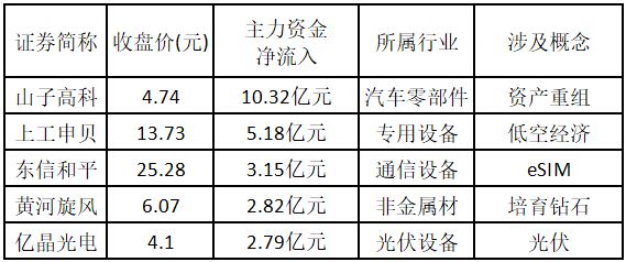 从主力资金来看,今日涨停板个股中,主力资金净流入金额排名前5的个股分别为山子高科、上工申贝、东信和平、黄河旋风、亿晶光电。