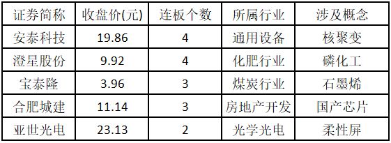 从连板情况来看,今日首板个股有26只;2连板的个股有7只;3连板及以上的个股有4只。今日连板数排名前5的个股包括安泰科技、澄星股份、宝泰隆、合肥城建、亚世光电,具体如下表所示。