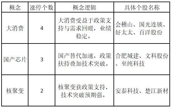 从概念特征来看,今日涨停板个股中,大消费、国产芯片、核聚变概念的个股最多。