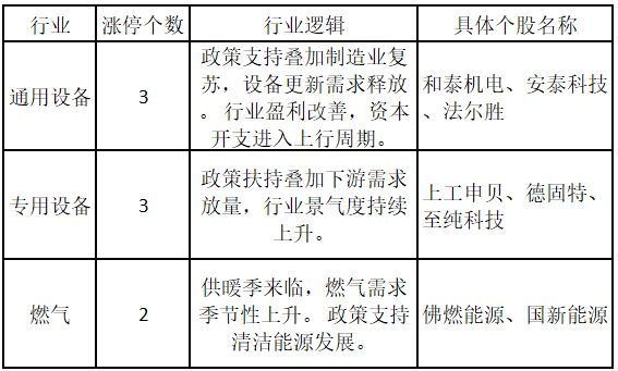 从行业特征来看,今日涨停板个股中,通用设备、专用设备、燃气行业的个股最多。