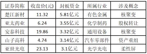 从封板资金来看,今日涨停板个股中,封板资金排名前5的个股包括楚江新材、亚太药业、安泰科技、山子高科、亚世光电。