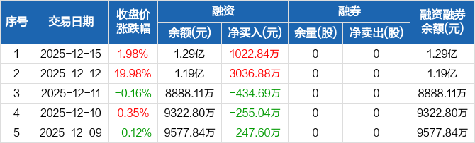融资方面,当日融资买入8396.9万元,融资偿还7374.06万元,融资净买入1022.84万元。融券方面,融券卖出0股,融券偿还0股,融券余量0股,融券余额0元。融资融券余额合计1.29亿元。